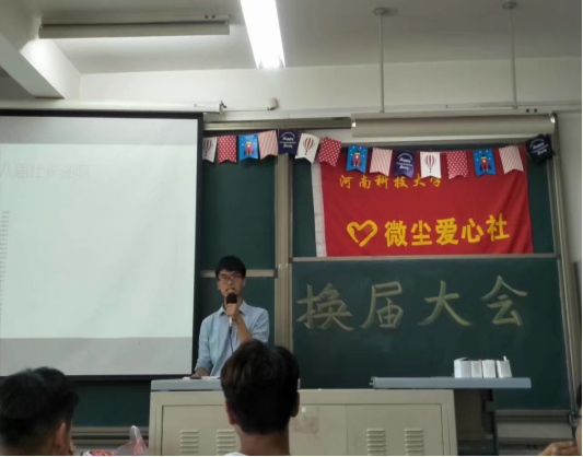 大会伊始,上任社长刘鹏翥回顾了一年来的工作感受以及不足之处,并对大家能够热情积极的投入到新的工作中表示感谢。接着新一届社长陈丽、理事长刘欣欣,副社长姚玉红、黄帅、孟琳涛与大家共同分享了社团工作的心路历程、感想以及各自对未来工作的构想。分享过后全体成员观看了2017-2018学年微尘爱心社组织的每项活动剪辑出来的视频。视频观看结束后上任部长们对从属部门一学年的具体工作进行了经验总结与分享。最后,微尘爱心社总负责人范叔为这一学年表现优秀的外联部和办公室进行了颁奖, 并教导微尘爱心社成员要常怀一颗感恩之心,只有这样才能做好微尘爱心社未来的志愿服务工作。